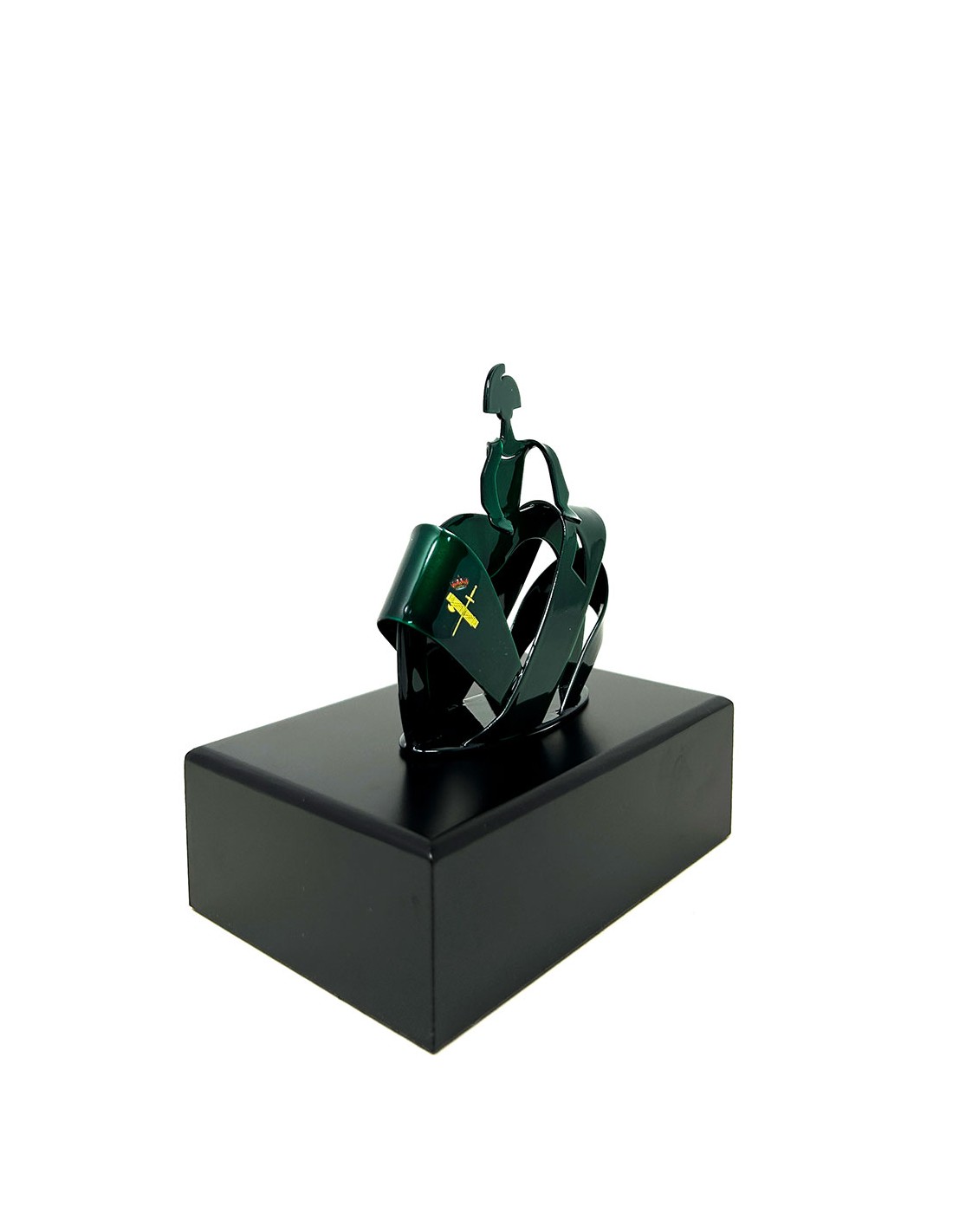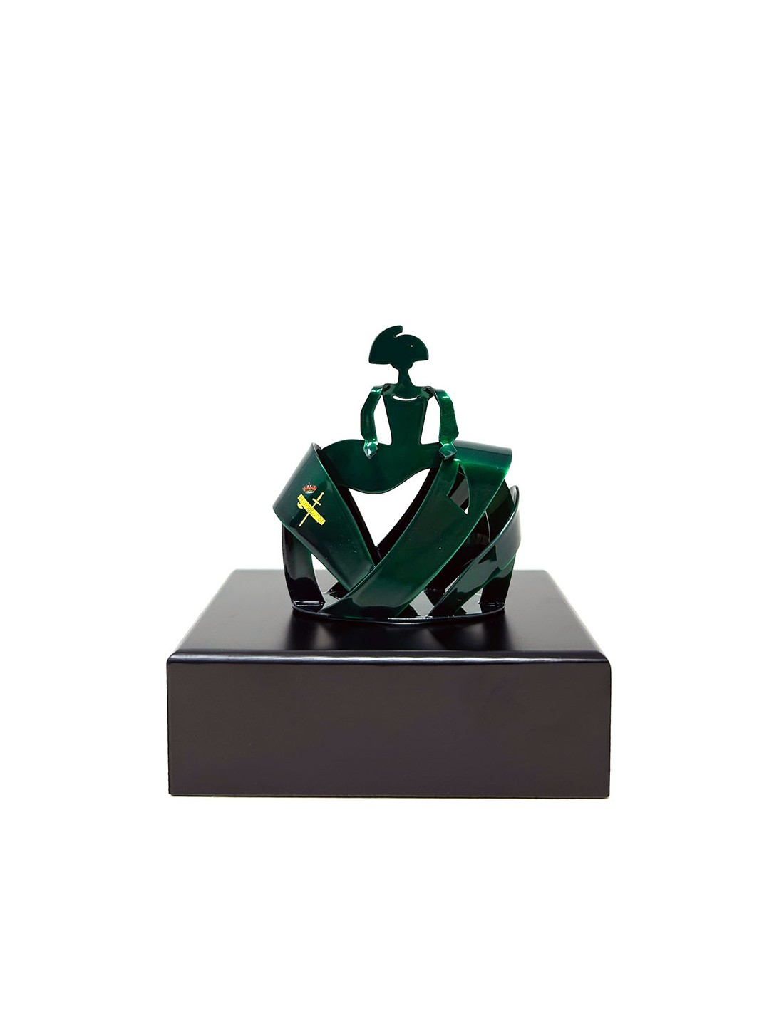 Trofeo con el escudo de la Guardia Civil, Con figura de Menina fabricada en chapa de acero y lacada en verde cristal, con base de madera lacada en negro mate.
