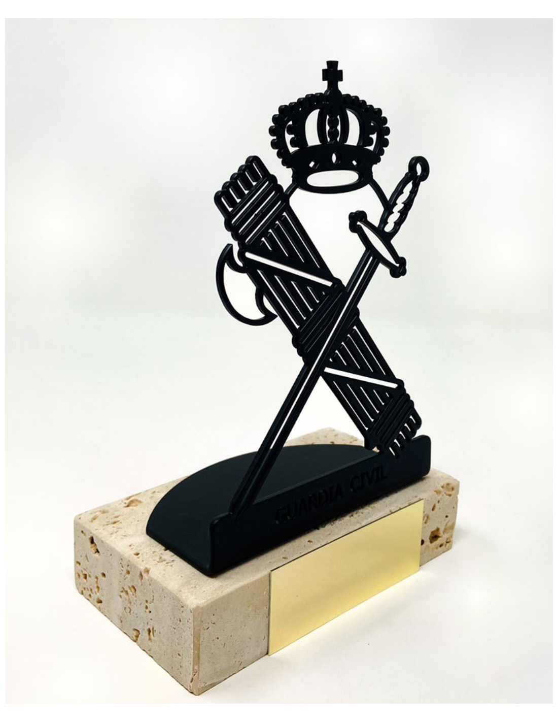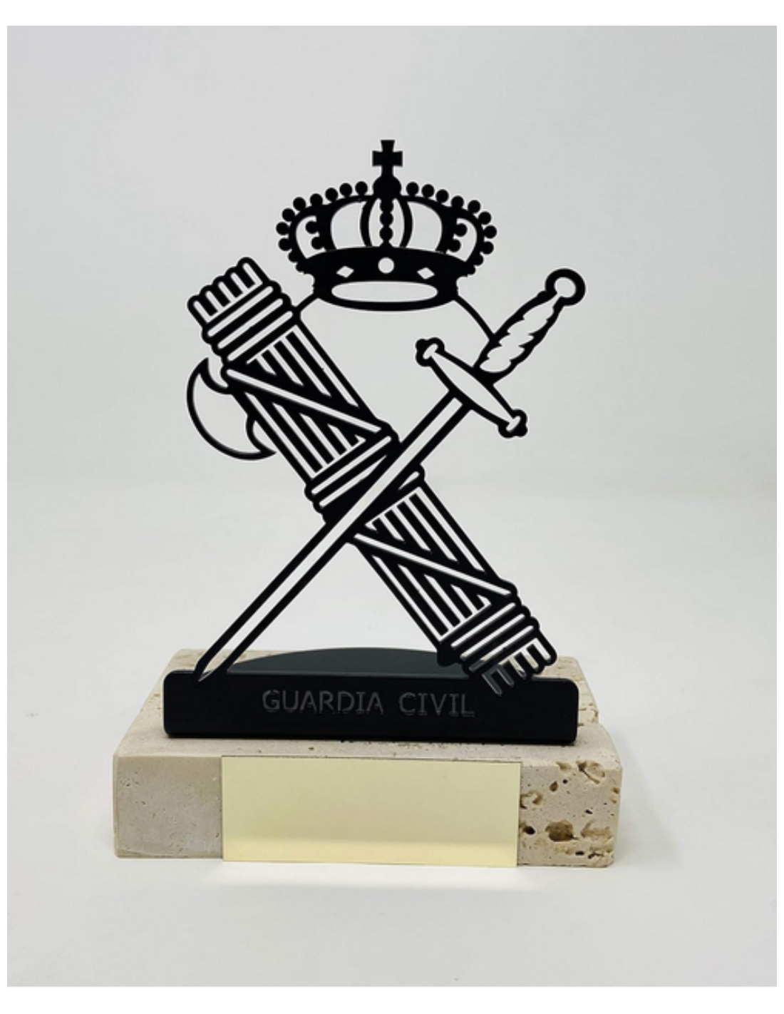- Trofeo de la silueta del Escudo de la Guardia Civil, lacado en negro y con peana de mármol travertino.